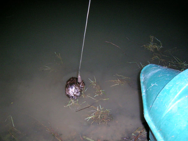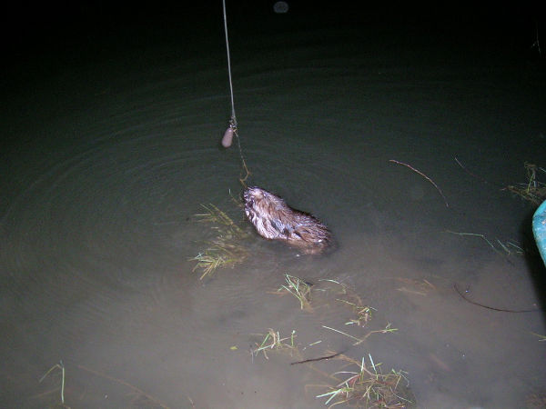 Dus hebben we de onderlijn net boven de haak doorgesneden en die beverrat of wat het ook was schoot weer het water in.