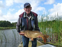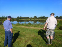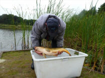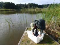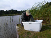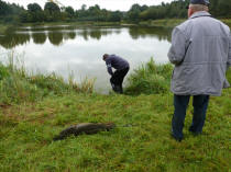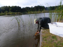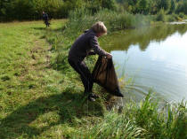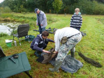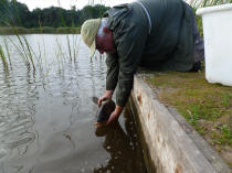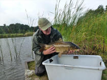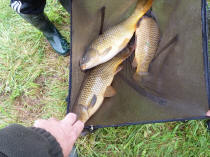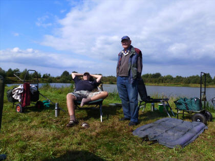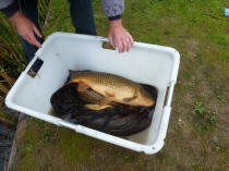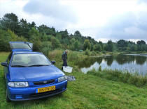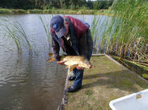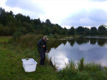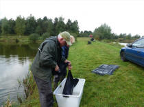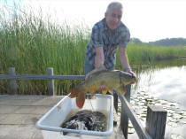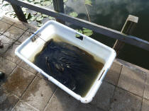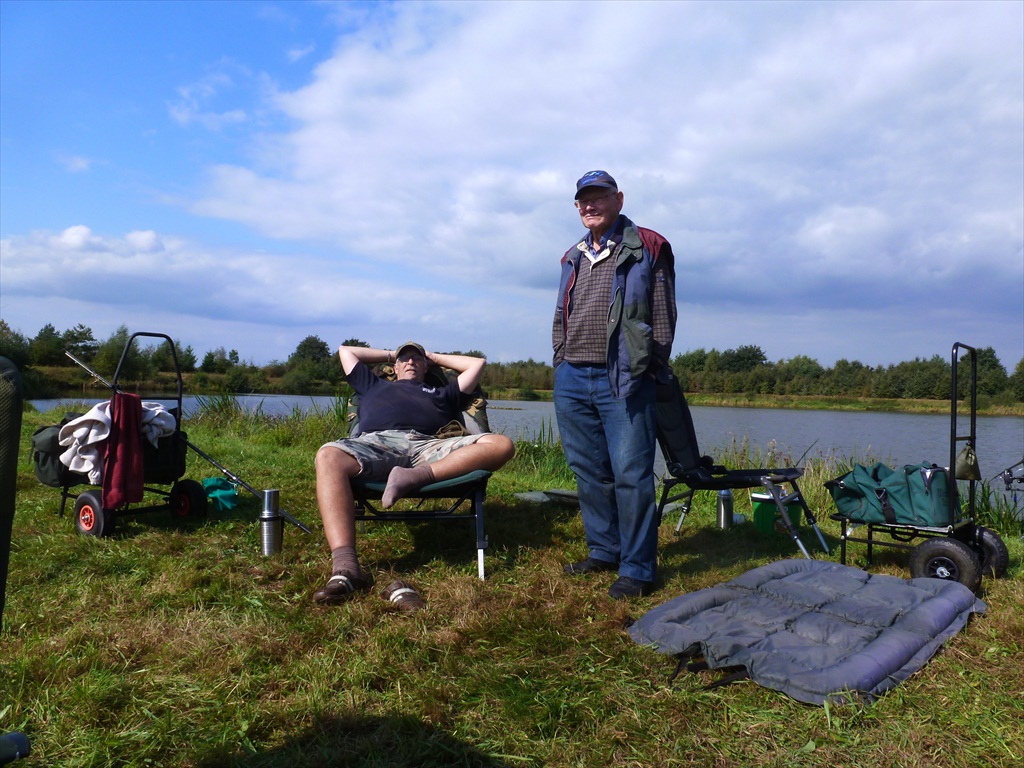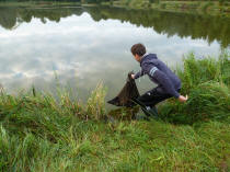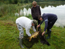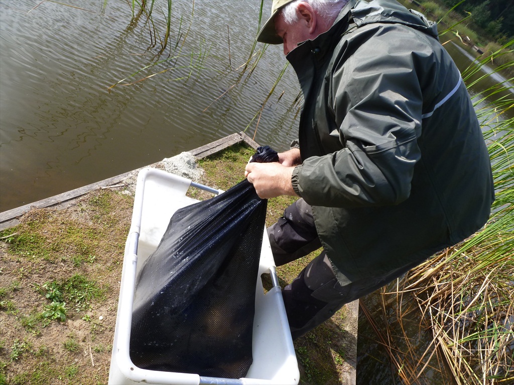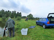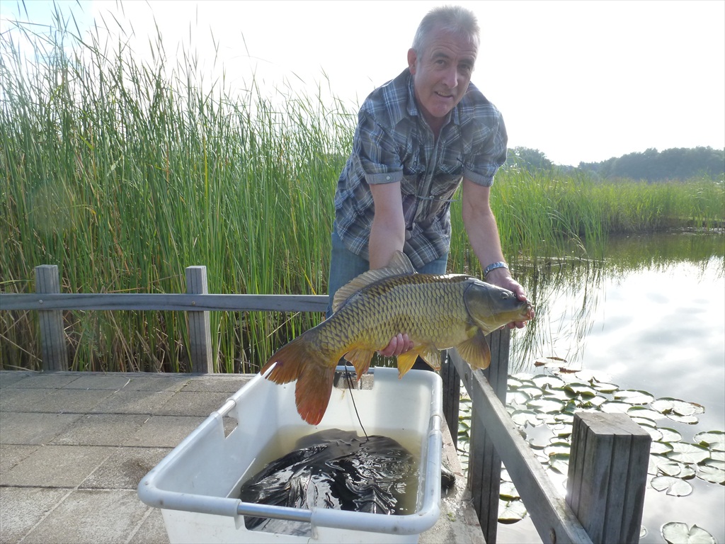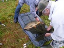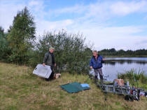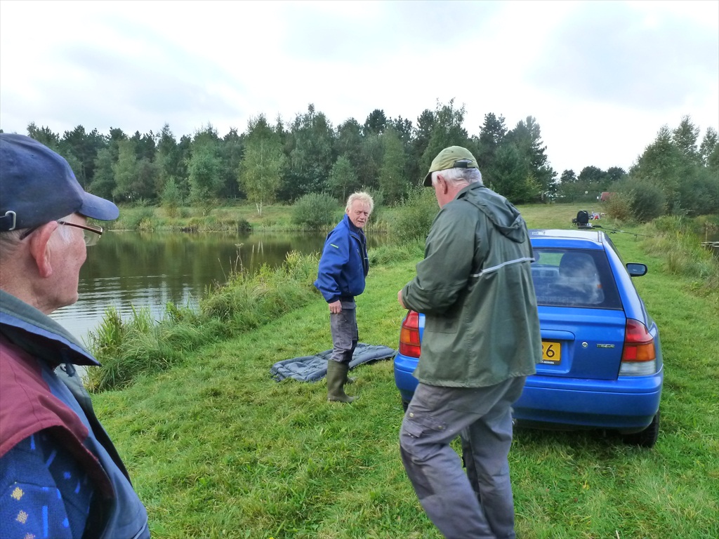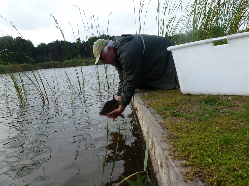 De eerste zaterdag (8september) verliep alles redelijk vlotjes. Bij aankomst was het nog aardedonker. Piet was de eerst aanwezige. Na wat standaard babbel over 't weer en de zak van Sinterklaas, zijn we snel met onze voorbereidingen begonnen. Je voelt dat de herfst grip op de zomer begint te krijgen en de vis niet lang actief zal blijven. Om 12 uur lag de laatste van de dag, karper nummer 9 op het matje. Steeds als er drie in de bewaarzak zaten werden ze in een ruime bak met water voorzichtig overgebracht naar het Camps Koêl. |
