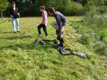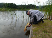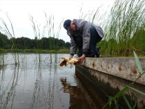 Eenmaal terplekke zwommen ze statig de diepte in, op weg naar hun nieuwe bestemming. Het was uiteindelijk een prachtige nazomerse dag geworden. 24 graden en geen zuchtje wind. Moe maar voldaan hebben we de eerste dag succesvol afgesloten. |