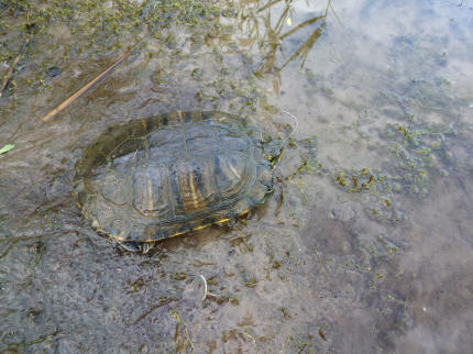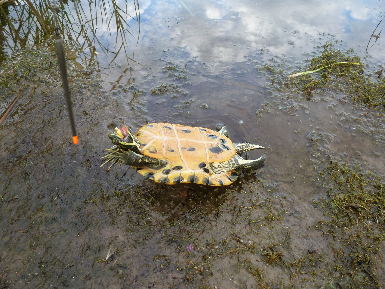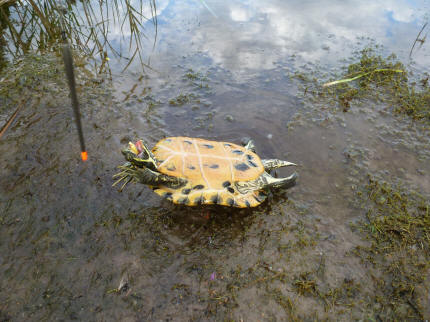 Huub zal raar op z`n neus hebben gekeken toen op vrijdag 3 augustus 2012 bleek dat een mooie aanbeet geen karper maar “Stoffel” de schildpad bleek te zijn. Het komt vaker voor dat mensen huisdieren uitzetten omdat ze te lastig zijn. Hoe grappig het ook uitziet als je ergens z`n koppie uit het water ziet steken, hij hoort hier niet thuis. Tja, en ”Stoffel”, die trekt natuurlijk bij het aanzien van zo`n groot mensenhoofd de zijne meteen in. Huub heeft het snoertje moeten doorknippen omdat de haak veel te diep zat. Het haakje zal er ter zijne tijd hopelijk uitzweren. Een week later is hij weer gezien in gevecht met een vette strontvlieg.
