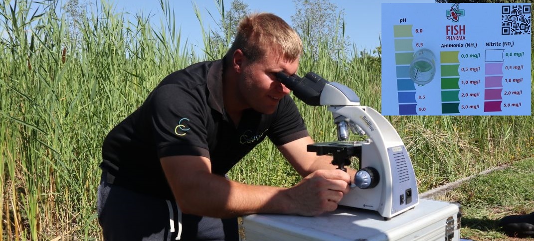 Als eerste werd er een zeer uitgebreide wateranalyse uitgevoerd. Verschillende flesje werden met vijverwater precies tot een bepaalde hoogte gevuld, waarna ze gekleurd werden met testvloeistoffen die verkleurden wat een bepaalde uitslag ten gevolg had. Deze test werd positief bevonden wat betekende dat de waterkwaliteit prima was en dat dit weer de vissen ten goede komt. |