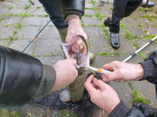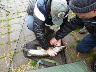 Soms is het niet verkeerd om je grenzen eens te verleggen. Of zoals het spreekwoord luidt "Verandering van spijs doet eten". Fout!! Snoeken is absoluut dramatisch als je er geen bal van kan. Gelukkig hadden de echte specialisten meer geluk. Na wat nodeloos gehark met een plastic visje hadden wij het al snel gezien. Patrick met zijn vismaat demonstreerden meteen hoe het wel moest. Binnen een zucht en een scheet werden twee mooie snoeken gevangen. Een week eerder mocht de jeugd ons een poepie laten ruiken. Buiten snoek werden er ook diverse grote Baarzen gevangen. |