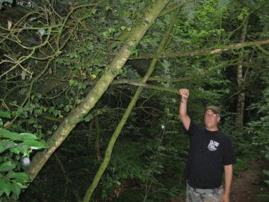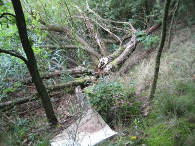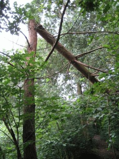 Omgewaaide bomen die boven de wandelpaden hangen en dreigen ieder moment omlaag te komen. Dit zijn gevaarlijke situaties en zou ook wandelaars willen adviseren deze paden niet meer te gebruiken. |