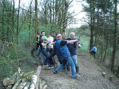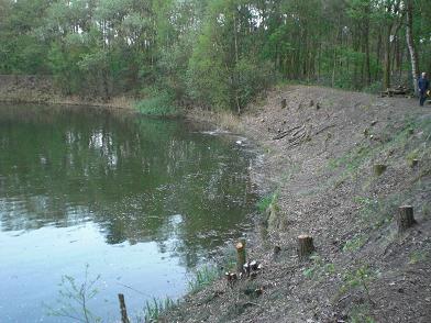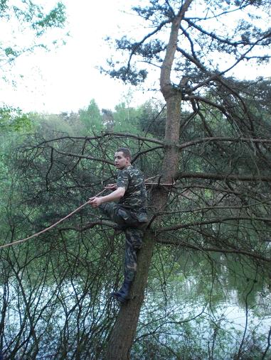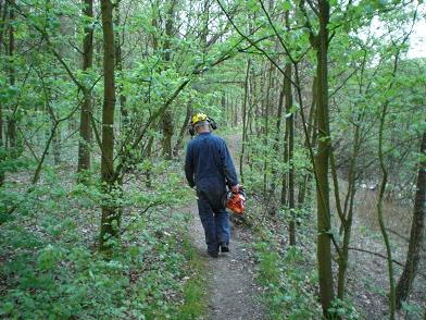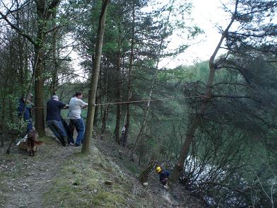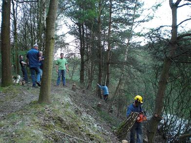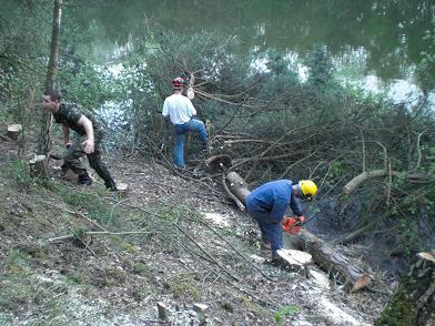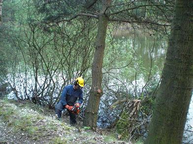Ongelofelijk wat de natuur in 25 jaar kan woekeren. De bomen op de helling zijn wildgroei en moeten worden gekapt. Om te voorkomen dat ze met de kap niet in het water terecht had men ze gezekerd met touwen. Toch kon niet verhinderd worden dat het anders verliep als gepland. Met een grote slag nam deze uit model geraakte dennenboom, onder luid gelach een duik in het water. Geen enkel punt, want de heren hadden in een mum van tijd alles weer netjes op het droge. Met goed gereedschap en portie kennis van zaken, lijkt het allemaal een peulenschil. Met een handzaag en een bijl, hadden ze er een tien jaren plan van kunnen maken.