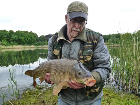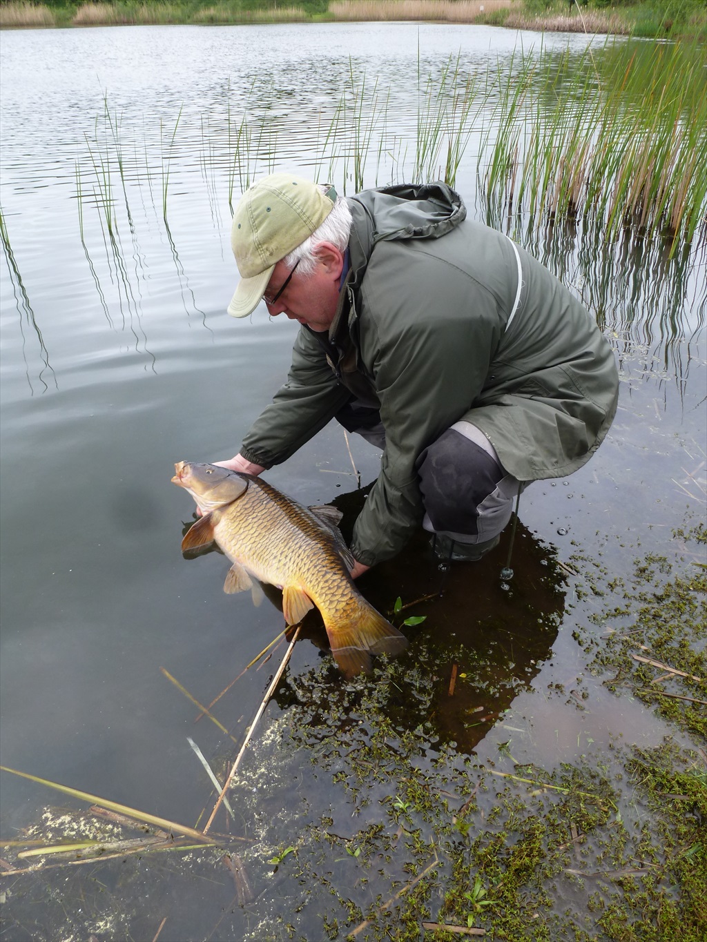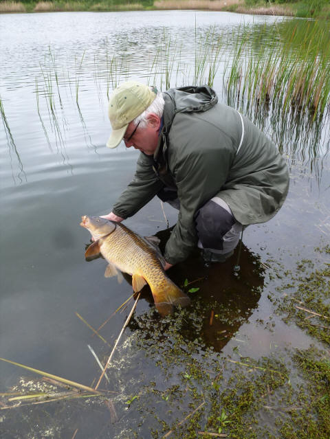 Al met al is het Schörfven voor de penvisser toch wel de hemel. Prachtig mooie rietkragen en stukken van lekker gras met lelieveldjes maakten deze vijver tot één van de mooiste vijvers in de regio Noord Limburg. Maar helaas, aan alles komt een eind. Toch niet getreurd het Campskoêl kan mits een goede begeleiding en controle zeer zeker, ook een hele mooie vijver worden. De toekomst zal het leren. << Piet had de vetste vis op het matje. |